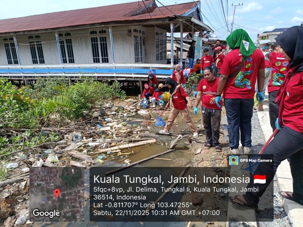 Pagi hari, puluhan mahasiswa pecinta alam menembus arus Sungai Pengabuan dari Dermaga Kuala Tungkal. Dengan perahu kecil, mereka mengangkat sampah plastik, styrofoam, hingga limbah rumah tangga yang mengambang tanpa henti, potret nyata bahwa sungai ini tengah berada di ambang “kematian ekologis”. Berbagai organisasi Mapala hadir, Mapala Siginjai, Mapala Sutha, Mapala Oase, Mapala Caldera, Mapala Kalpatriks, Mapala Tapak Rimba, Mapala Gema Cipta Persada, serta KPA Gita Buana Club. DLH Tanjab Barat turut memberikan dukungan teknis dan edukasi persampahan di lapangan.